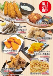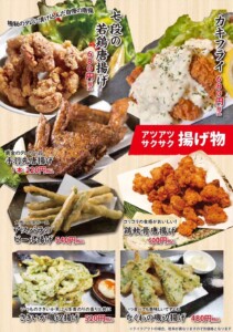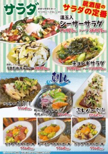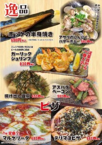 本日のサラダ チキン南蛮 マルゲリータピザ 揚げ物盛り合わせ ・飲み放題 ビール・ハイボール・サワー各種・酎ハイ各種・泡盛各種・ソフトドリンク |