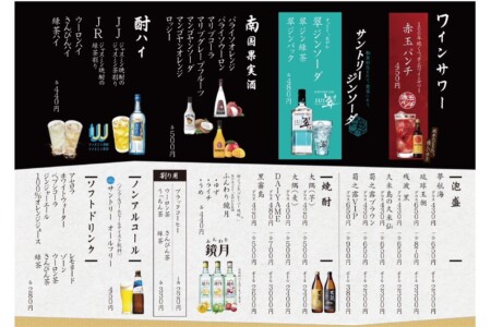 | お茶割/酎ハイ | JJ(ジャスミン焼酎×ジャスミン茶) / JR(ジャスミン焼酎×緑茶) / JS(ジャスミン焼酎×炭酸) / ウーロンハイ / さんぴんハイ / 緑茶ハイ |