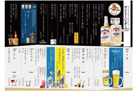 | ハイボール | ジムビームハイボール / メーカーズマークハイボール / ティーチャーズハイボール / 碧ハイボール / 角ハイボール |